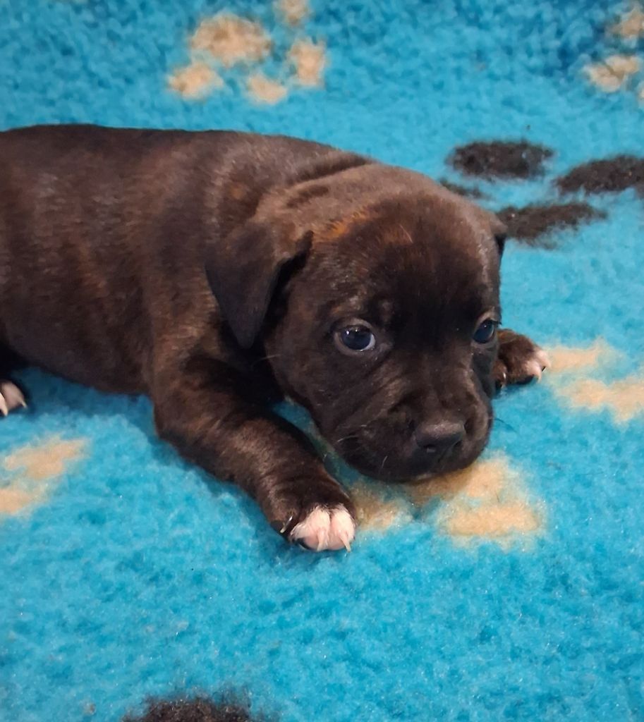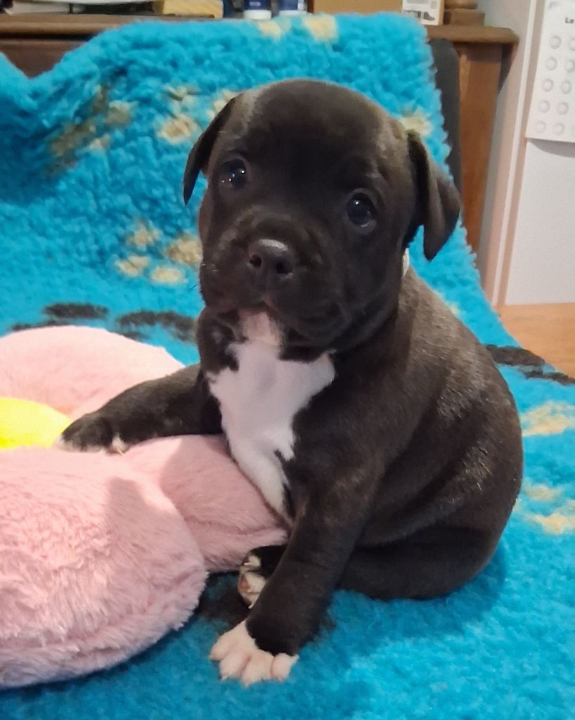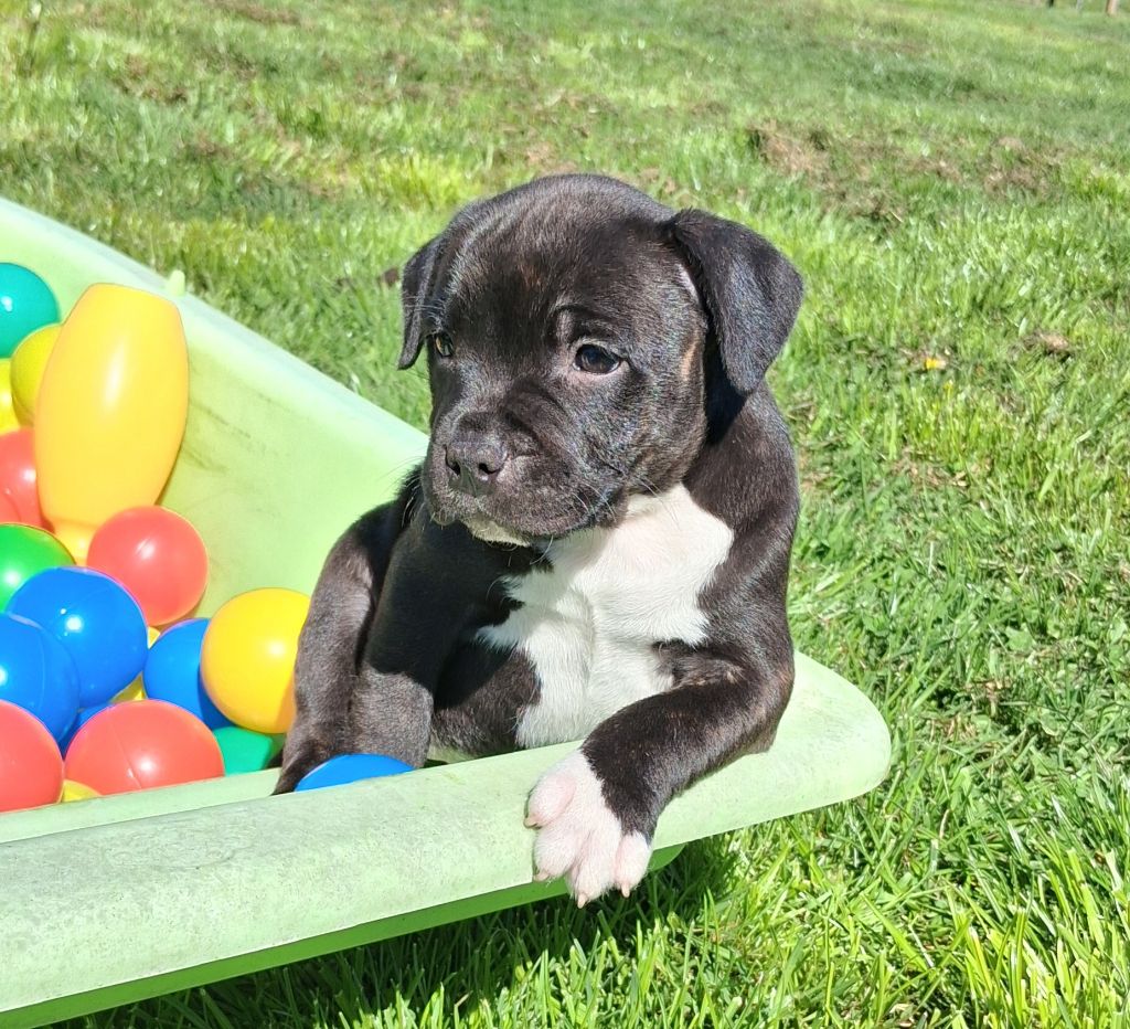 Très jolie femelle noir bringue pand blanc très sociale et curieuse. Elle partira avec 1er vaccin identifié vermifuge certificat de bonne santé et naissance kit chiots les parents sont tests l2hga et hc adn et visible à l élevage